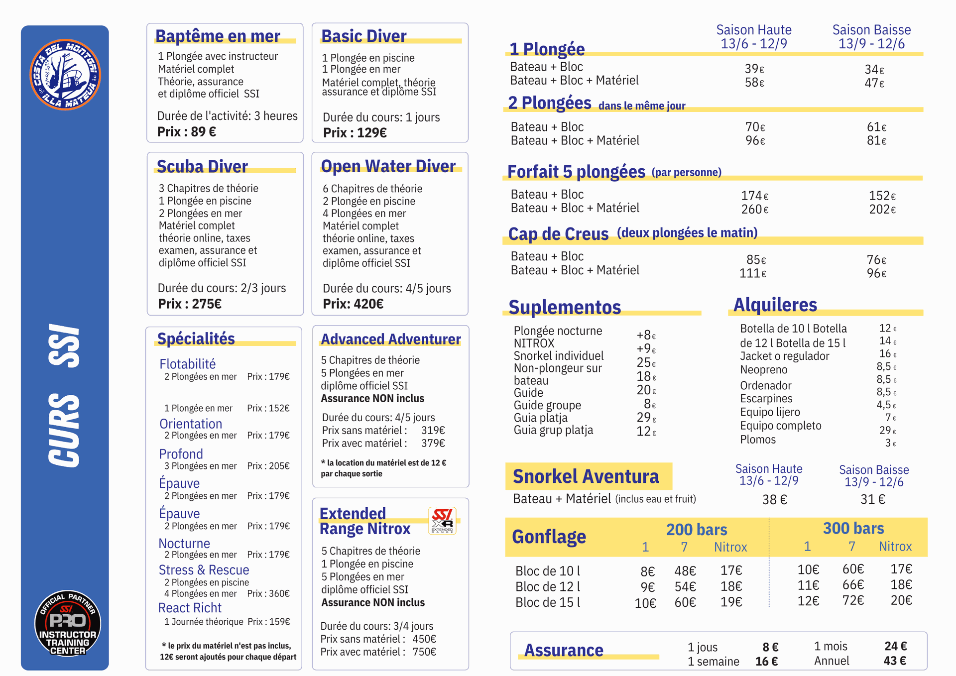 Tarifs pour la saison 2026